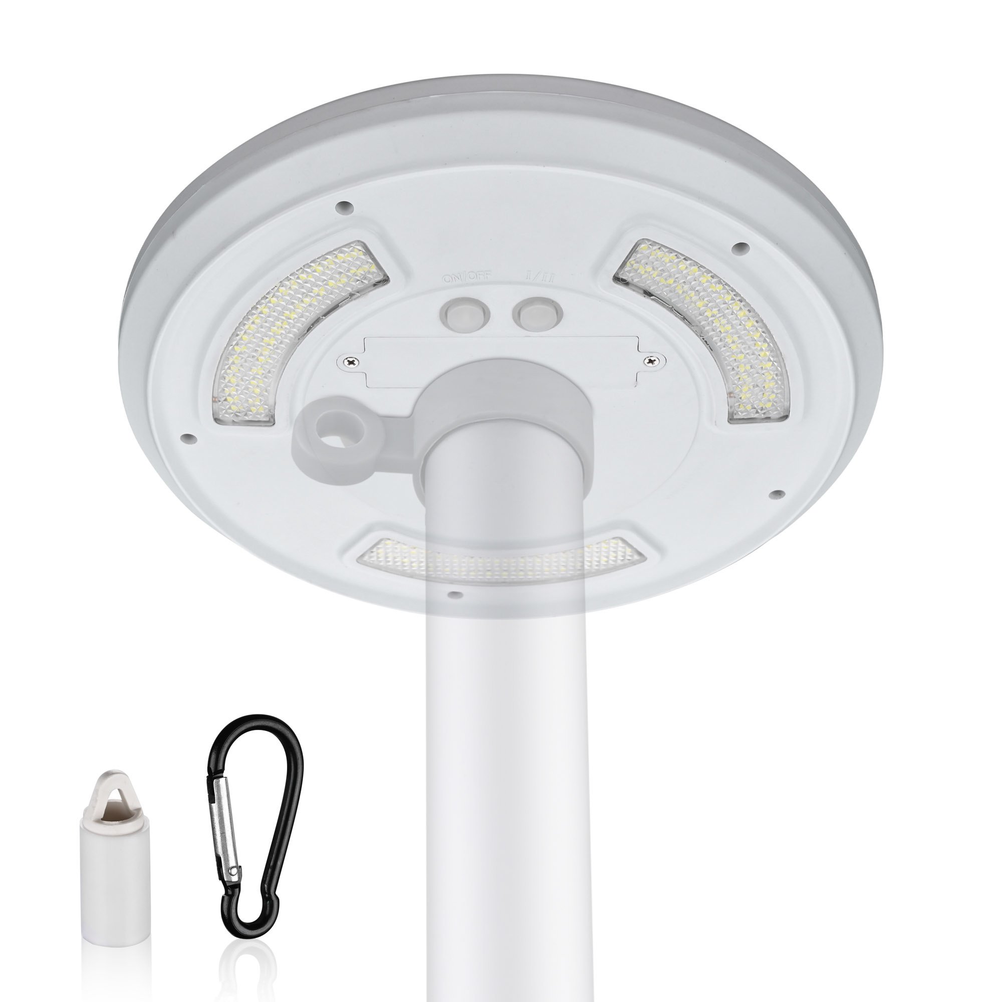 - Solar Powered Flagpole Light - Solar Flag Pole Light with 111 cool white LEDs emits 555 lumens of bright light, lighting up your flag & flag pole ornaments in the darkness for eye-catching decoration; Also can be installed by carabiners onto the gate for outdoor lighting such as camping, roadside, courtyard, etc.
