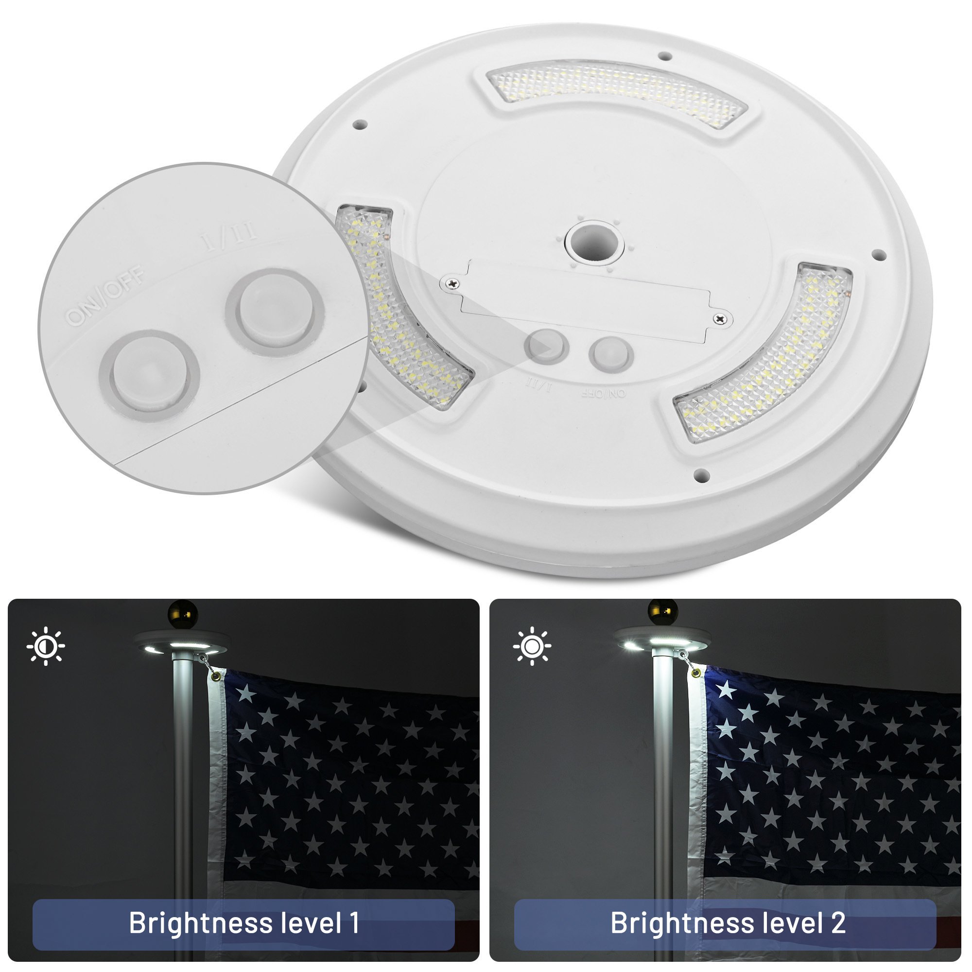 - Automatic On/Off - With light sensor, the flagpole light automatically turns on during the night or in the dark environment, automatically switches off and charges during daytime; 2 levels brightness allows you to adjust brightness level according to your need